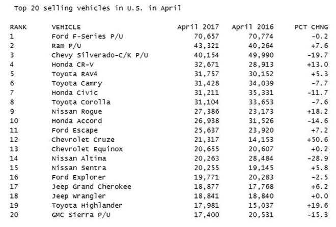 The Ford F-Series’ domination of the sales chart continues as the truck was the top selling vehicle in the United States for the month of April.