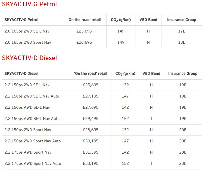 Customers in the UK will be offered the choice between three engine options: one petrol and two diesel units. Petrol models will be powered by a 2.0-litre Skyactiv-G unit with 165PS, and will be offered exclusively with front-wheel drive and a six-speed manual gearbox.