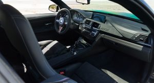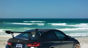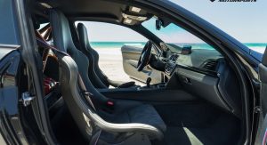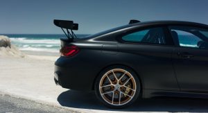 For starters, the Sapphire Black Metallic paint has been adorned in a protective bra that not only protects it but makes the paint appear as if it was matte black. Elsewhere, the track-focused M4 has been installed with a huge rear wing that ascends far higher into the sky than the wing usually found on the car.