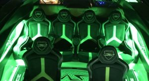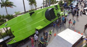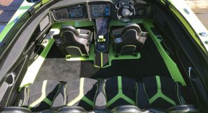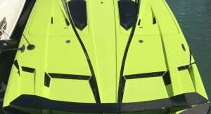 This 52-foot MTI G6 is done up inside and out in the same special shade of Verde Singh as the supercar, with coordinating Alcantara upholstery, carbon-fiber trim… the works. It even wears the door panels, lighting, steering wheel, and marinized switchgear from the Aventador. Oh, and there’s the small matter of the engine: not one of Lamborghini’s own maritime mills, but a single Mercury Racing engine that’ll kick out 1,350 horsepower on 91-octane gasoline, or 1,550 on 112 AKI race fuel. That’s said to be enough to propel the carbon-fiber catamaran to a top speed of 180 miles per hour on the open water.