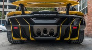 Almost every single body panel has been painted yellow except for the roof and a large portion of the rear fascia which is instead a mish-mash of yellow, carbon fiber, grey and black.