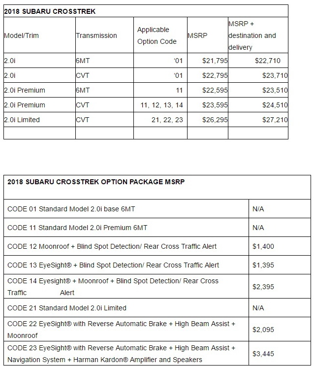 Subaru announced the pricing of the new 2018 Crosstrek, the second model in the company’s range to take advantage of their fresh Global Platform.