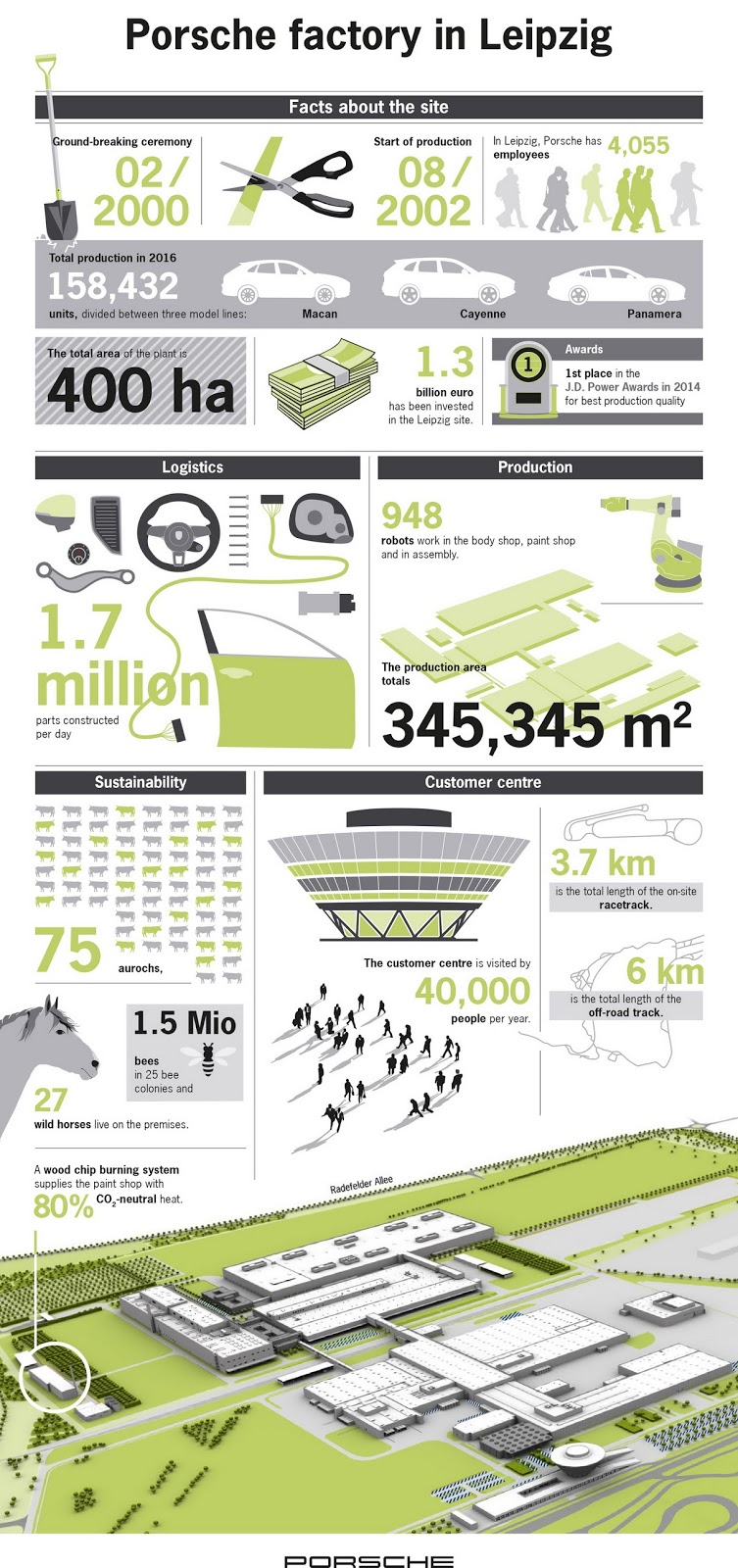 Besides the 2018 Porsche Panamera Sport Turismo, the automaker is also producing the Macan and Cayenne at their Leipzig factory. According to the infographic below, this is where 158,432 units were produced in 2016, on the 400-hectare plant that’s home to 4,055 employees. 948 robots work in the body shop, paint shop, and assembly, and €1.3 billion ($1.5 billion) have been invested into the plant in total since production commenced in August, 2002.