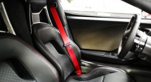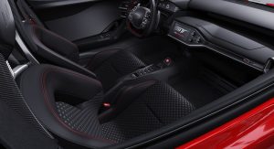 The GT ’67 Heritage Edition consists of a Race Red exterior paint scheme with white stripes and the available exposed carbon fiber package. Further distinguishing it from the ‘regular’ GT are Frozen White No.1 graphics on the hood and doors, 20-inch one-piece forged aluminium wheels, red brake calipers and silver wing mirror caps.