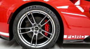 The Heritage Edition will only be available on 2018 model year Ford GTs and also incorporates some interior changes, including carbon fiber seats with red stitching, red seatbelt webbing, anodized gray paddle shifters and dark stainless appliqués on the instrument panel, x-brace and door register bezels.