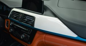While sporting the same front and rear carbon fiber spoilers, it has a more elegant interior – a mixture of black and light brown leather with blue inserts across the dash and on the door panels.