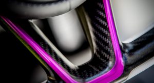 This car’s distinctive hue can also be found on the lightweight wheels, in contrast with the platinum finish of the alloy. Inside the car, the door appliques, a pinstripe on the steering wheel and the rear-view mirror are also painted Fux Fuchsia, while the rest of the cabin features either carbon fiber or MSO bespoke white leather with white stitching.