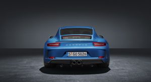 On the outside, it loses the recently facelifted GT3’s jumbo-sized rear wing gaining a more understated look with the regular 911 Carrera’s automatically deploying spoiler. Other unique features include the silver-colored side window strips, sports exhaust system tailpipes and headlight washer system covers, as well as the Porsche logo at the rear. In the “Black Exterior Touring Package” equipment option, these elements are in black, as with the 911 GT3. Finally, the front and rear lights are dark-tinted.