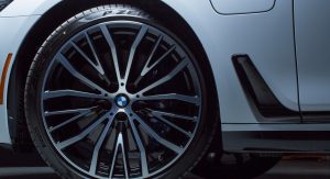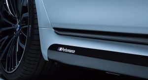 This 740e features blacked-out kidney grilles, to go with the M-specific bumpers front and rear, gloss black “Hockey Sticks”, a boot lid spoiler, carbon fiber mirror covers and a set of massive wheels with blue calipers hidden out of sight.