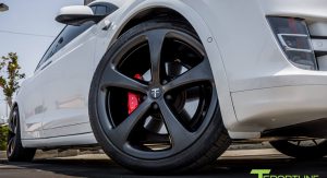 The matte black MX5 forged wheels measure 22″ front and rear, and feature a lug nut cover set painted in the same color, plus red calipers. By the way, we’ve seen these wheels before on another Pearl White Model X, except those were gloss black.