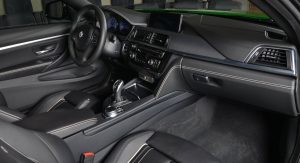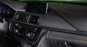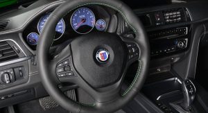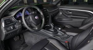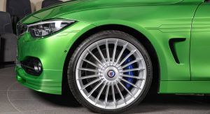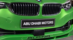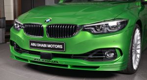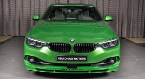 Building upon the latest Alpina B4 S Bi-Turbo, the car on display at Abu Dhabi has been fitted with a very specific body kit, whicn includes a front splitter and a boot lid spoiler. Everything was painted in Rallye Green, and this premium compact coupe also benefits from the tuner’s multi-spoke alloy wheels and a set of blue calipers.
