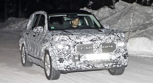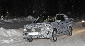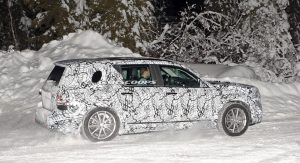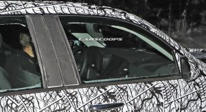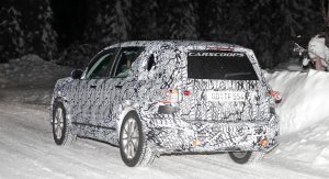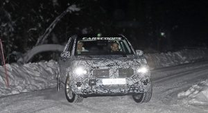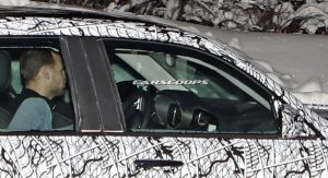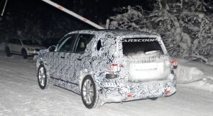 The test car was spotted undertaking some cold-weather testing, wearing a heavy camouflage that includes not only the usual swirly wrap, but also fake body extensions on areas like the bonnet and the rear roof section in a bid to keep its true shape under …wraps.