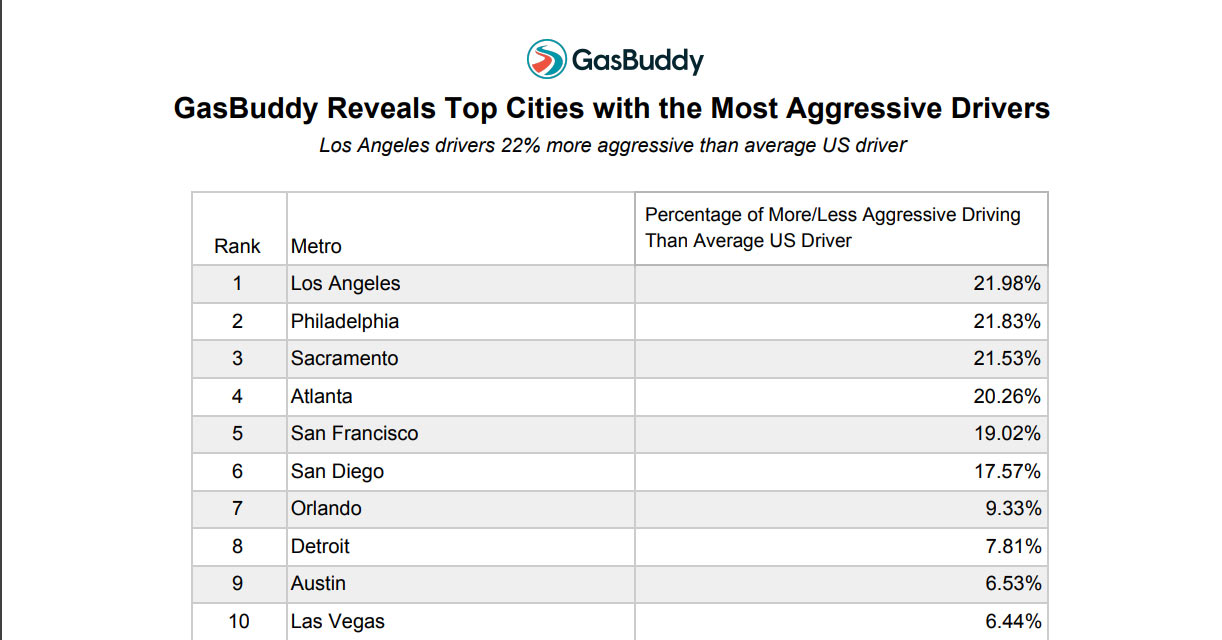According to a new study from GasBuddy, the most aggressive drivers in the United States are in Los Angeles. California was prominently featured on the top ten list as Sacramento was deemed the third most aggressive city, while San Francisco was fifth. San Diego also nabbed the title as the sixth most aggressive city.