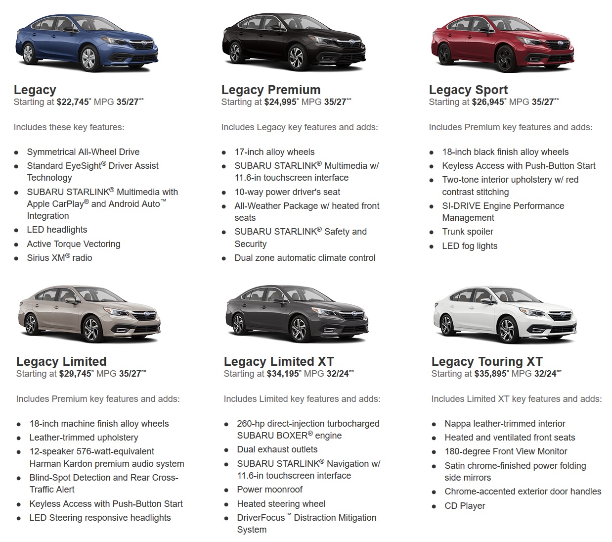 Buying the 2020 Legacy is going to cost you a bit more, as pricing ranges between $22,745 and $35,895, but each trim level is nicely specced. If you can get past by some of the things highlighted by the reviewer, then you will find a very good daily driver, with AWD and decent fuel economy.