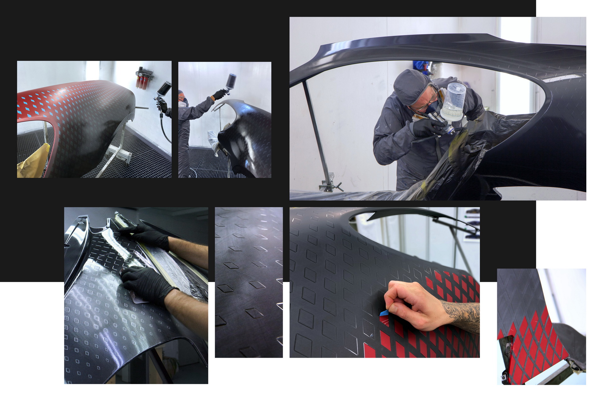 What he had in mind was a strict geometric pattern with diamond shapes in a unique metallic color contrast, dubbed ‘Customer Special Red’ and ‘Graphite’. The graphics were designed to run precisely from the front to the rear, in order to match the hypercar’s silhouette.
