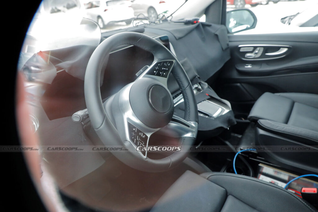 Though this silver prototype’s dashboard is partially disguised we can still make out a couple of other important details. One is that the facelifted V-Class appears to retain the updated touchpad controller introduced in 2019. That contrasts with other recent Mercedes vehicles, like the facelifted A-Class that ditched the touchpad altogether, leaving the driver and passenger to rely on touchscreen activation and voice commands to control the MBUX infotainment system.