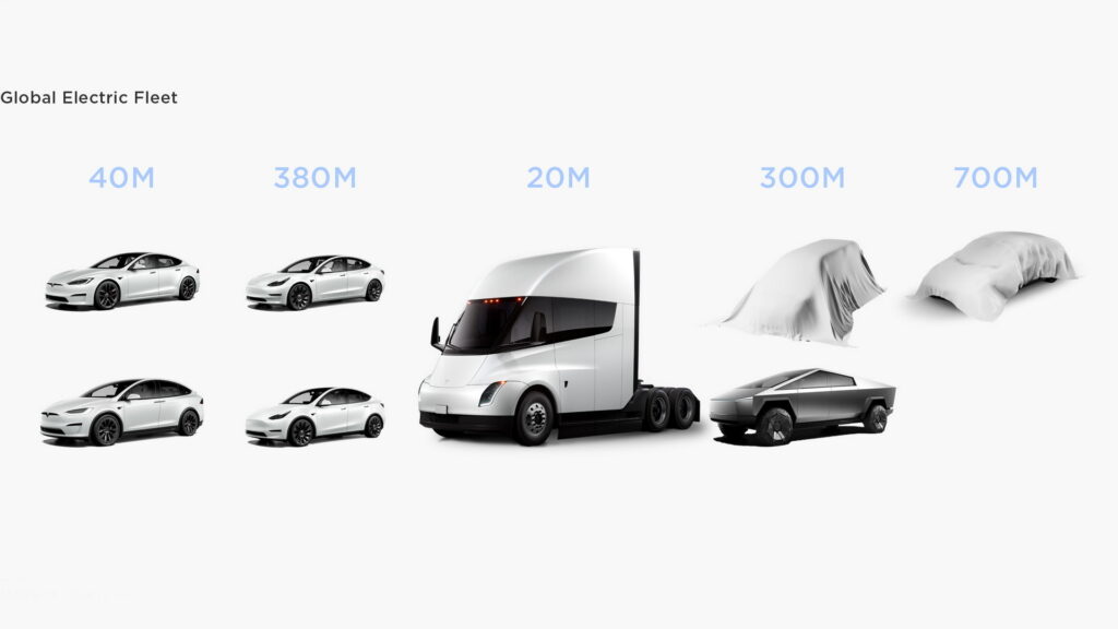 Unfortunately, there is not much to gain from the covered silhouettes of the unnamed EVs. However, the boxy shape of the first one alongside references in other parts of the presentation suggest it is an upcoming fully electric commercial/passenger van from Tesla. We don’t know if the teased model has anything to do with the robotaxi that Musk announced last year, although this one was described as a dedicated model with a “quite futuristic” look.