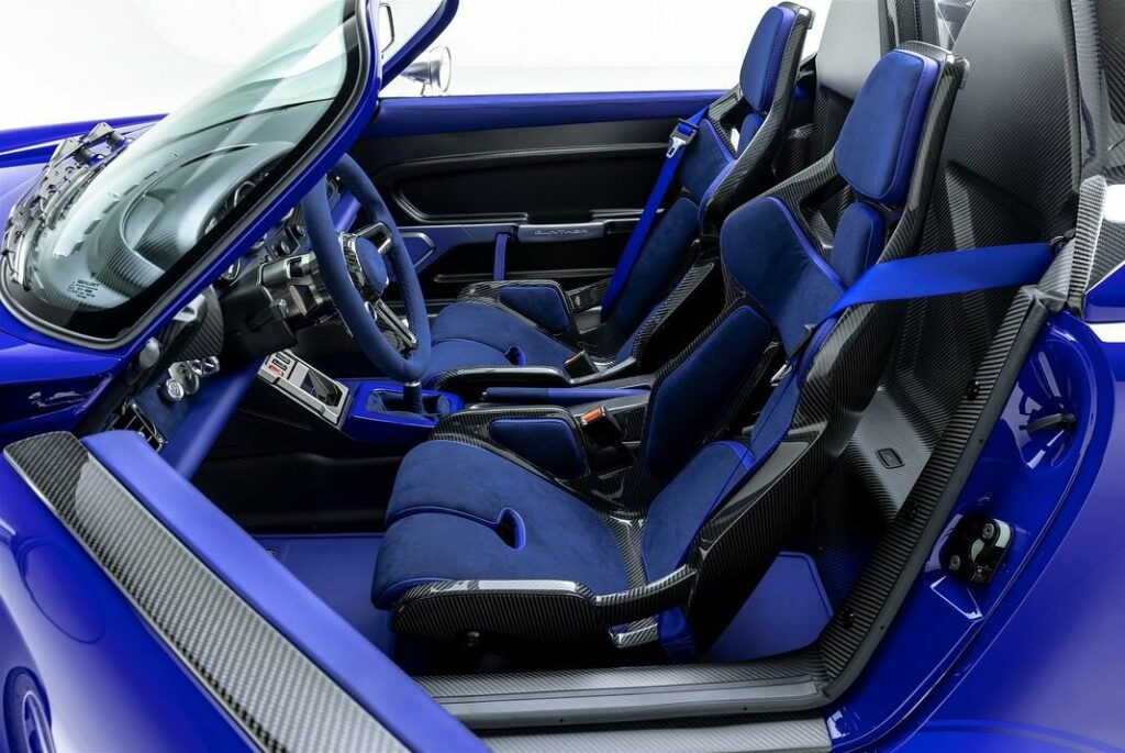 The individual who commissioned the car clearly loves the color blue as the interior has also been bathed in blue Alcantara across the seats, dashboard, steering wheel, and gear shifter boot. A pair of stunning carbon fiber-backed bucket seats, a carbon fiber dashboard with custom gauges, and a carbon fiber steering wheel complete the image of a stunning interior.