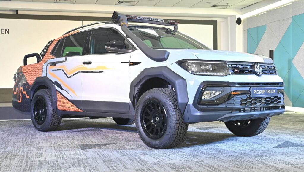 - The VW Taigun served as a base for a rugged pickup truck with weird proportions.