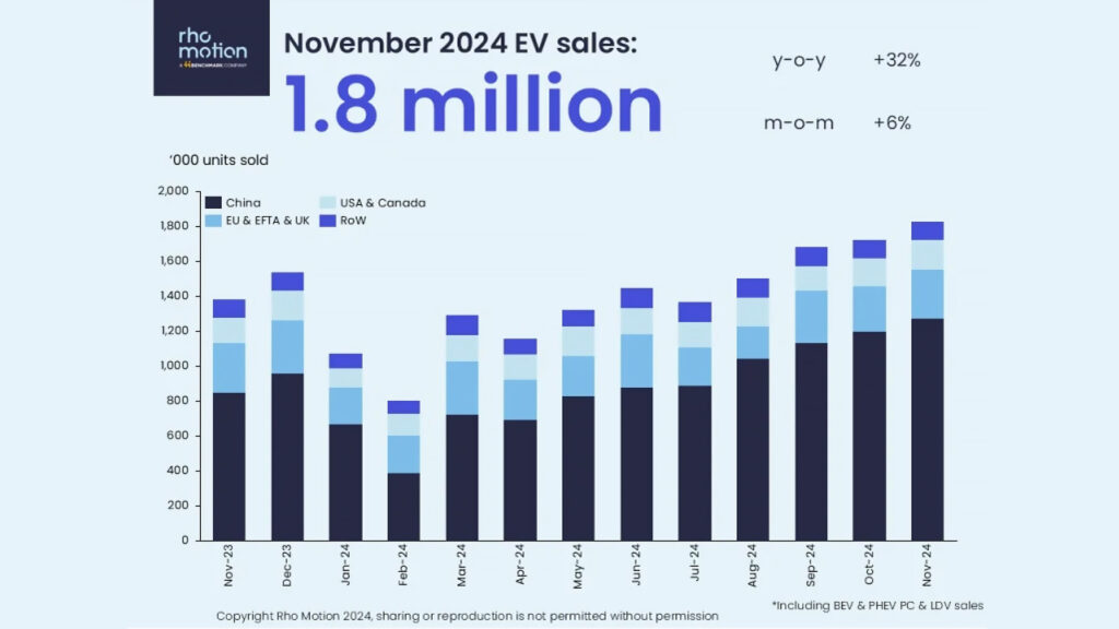 - November 2024 was the strongest month ever for global EV sales, with 1.8 million units.