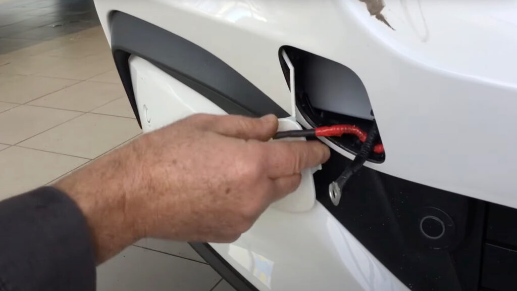 AAA was alerted but failed to open the car by applying a jump pack to the 12-volt battery in the frunk, which was unlocked via the emergency access door below the headlight. Ford Roadside Assistance was also called out, but before that second crew arrived – which was 90 minutes after the baby first became trapped – the owner had taken matters into his own hands and smashed a window to gain access.