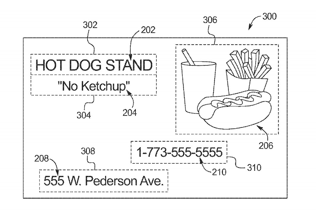 Although the patent doesn’t explicitly offer an example, the image associated with it shows a hot dog and fries, an address, a phone number, and a possible order on an infotainment screen.