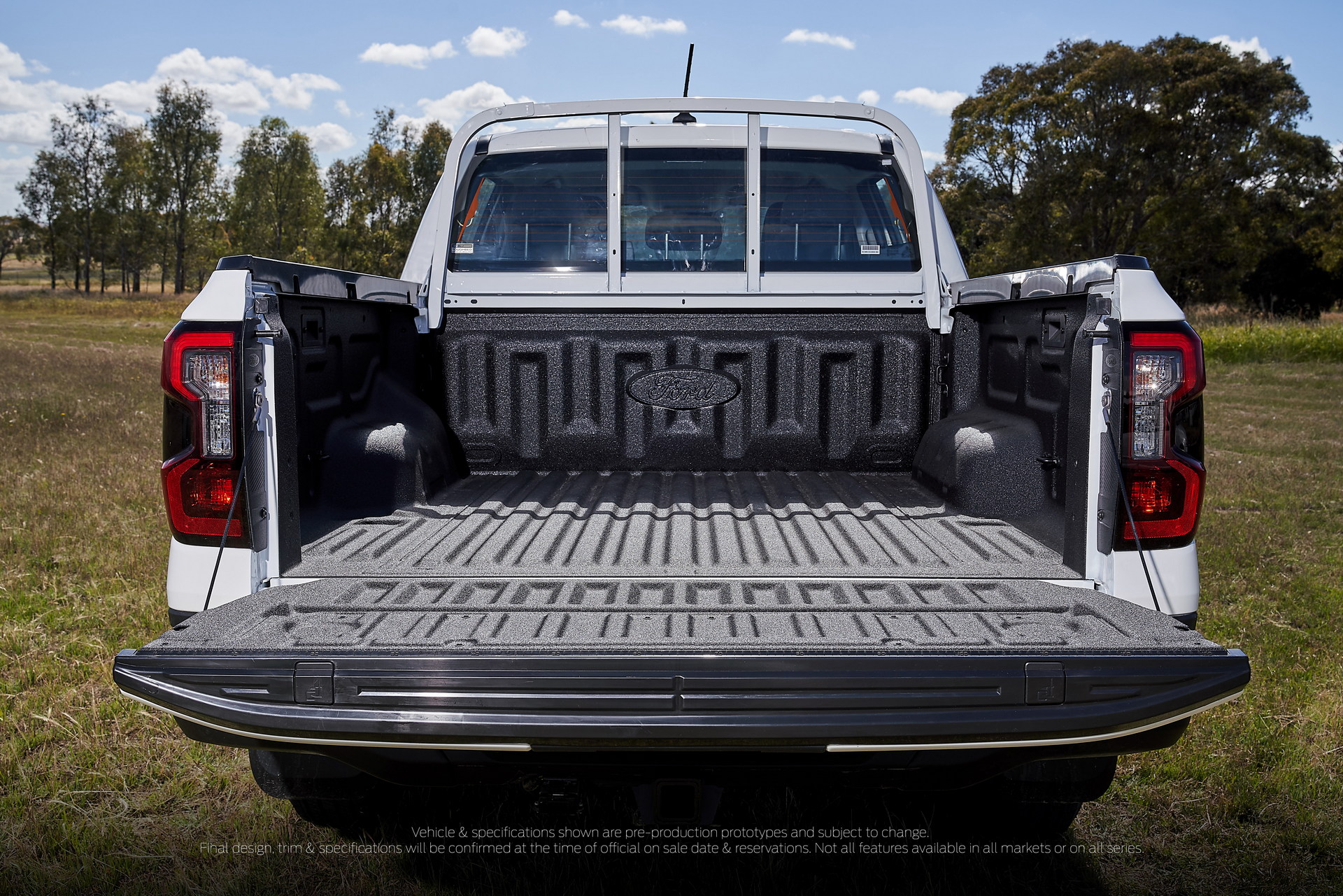 The drop-in bedliner with divider locators allows owners to create their own compartments using custom-made timber dividers. Ford says that the molded profile of the bedliner is more comfortable on your knees, less slippery, and easier to clean. Additionally, an internal rail with spring-loaded adjustable cleats on both sides of the bed makes it configurable for any kind of load. There are also external tie-down rails, and roof channel mounts for racks, with the roof being able to hold loads of up to 350 kg / 772 pounds static or 85 kg / 187 pounds dynamic.