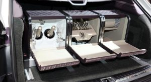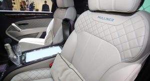 When you step inside the Bentayga Mulliner, opulence is the only word that comes to mind. There is new Ombré Burr Walnut Veneer throughout, including on the center console. Elsewhere there are illuminated tread plates, a 20-speaker audio system with a 1,950-watt, 21-channel amplifier, and a bottle cooler in the rear seat console that includes Cumbria Crystal flutes.