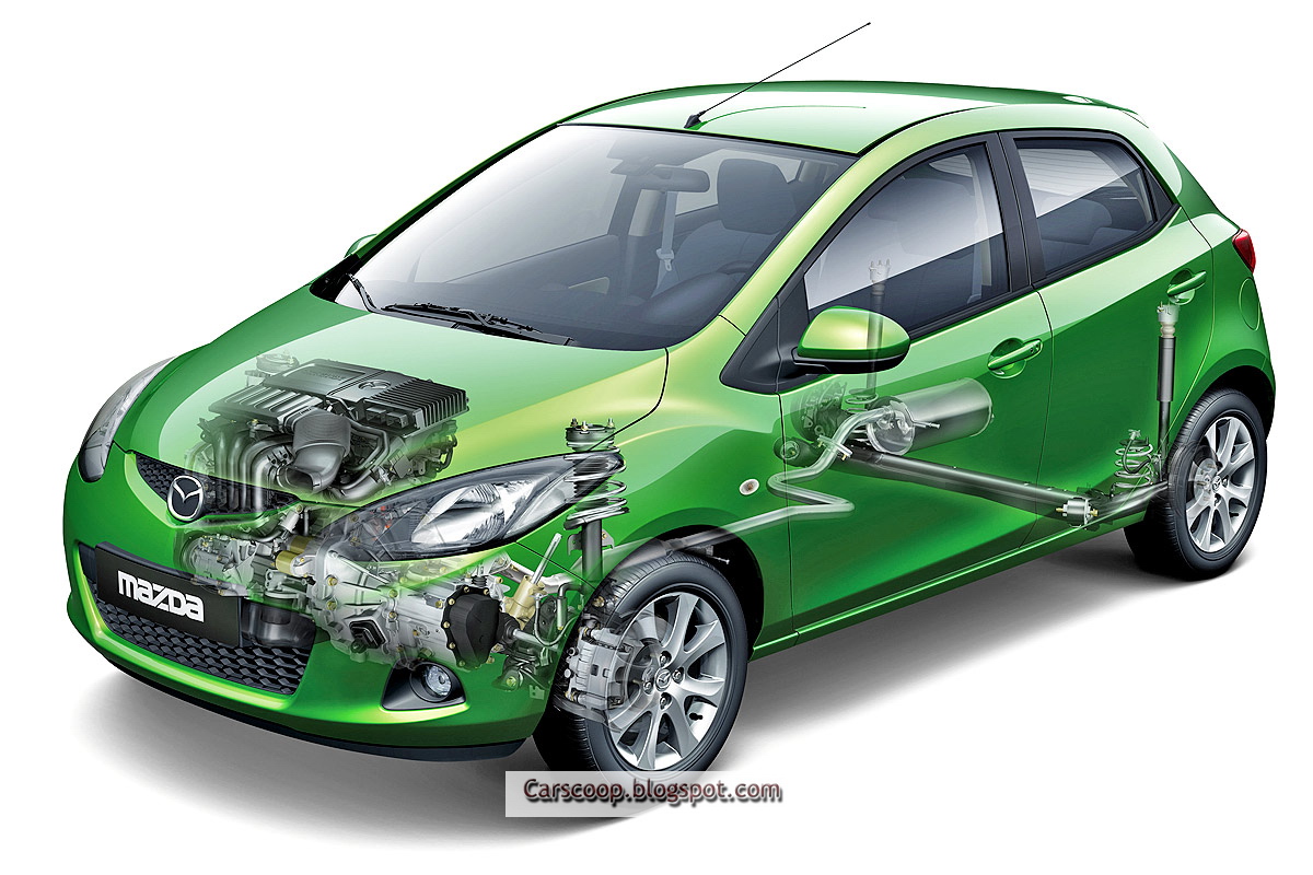 Dimensions Overall length 3885 mm Overall width 1695 mm Overall height 1475 mm Wheelbase 2490 mm Tread (front / rear) 1475 mm / 1465 mm (for 14- & 15-inch tyres) 1465 mm / 1455 mm (for 16-inch tyre) Seating capacity 5 people Boot volume 250 l Engine Type MZR 1.3-litre: In-line, 4-cylinder petrol engine MZR 1.5-litre: In-line, 4-cylinder petrol engine Max. output Target MZR 1.3-litre: 55 kW (75 PS) / 6000 rpm (standard power) 62 kW (84 PS) / 6000 rpm (high power) MZR 1.5-litre: 76 kW (103 PS) / 6000 rpm Max. torque Target MZR 1.3-litre: 118 Nm (12.0 kgm) / 3500 rpm (standard power) 121 Nm (12.3 kgm) / 3500 rpm (high power) MZR 1.5-litre: 136 Nm (13.9 kgm) / 4000 rpm Transmission Type 5-speed manual Suspension Type (front / rear) MacPherson strut / torsion beamBrakes Type (front/rear) Ventilated discs / leading-and-trailing drums Tyres 175/65R14 185/55R15 195/45R16 Wheels 14-inch steel wheels 15-inch steel & aluminium wheels 16-inch aluminium wheels Top speed* Preliminary 186 km/h (1.5-litre) Curb weight* Preliminary 954 kg (1.3-litre) Fuel consumption* Preliminary 5.4 L/100 km (1.3-litre)