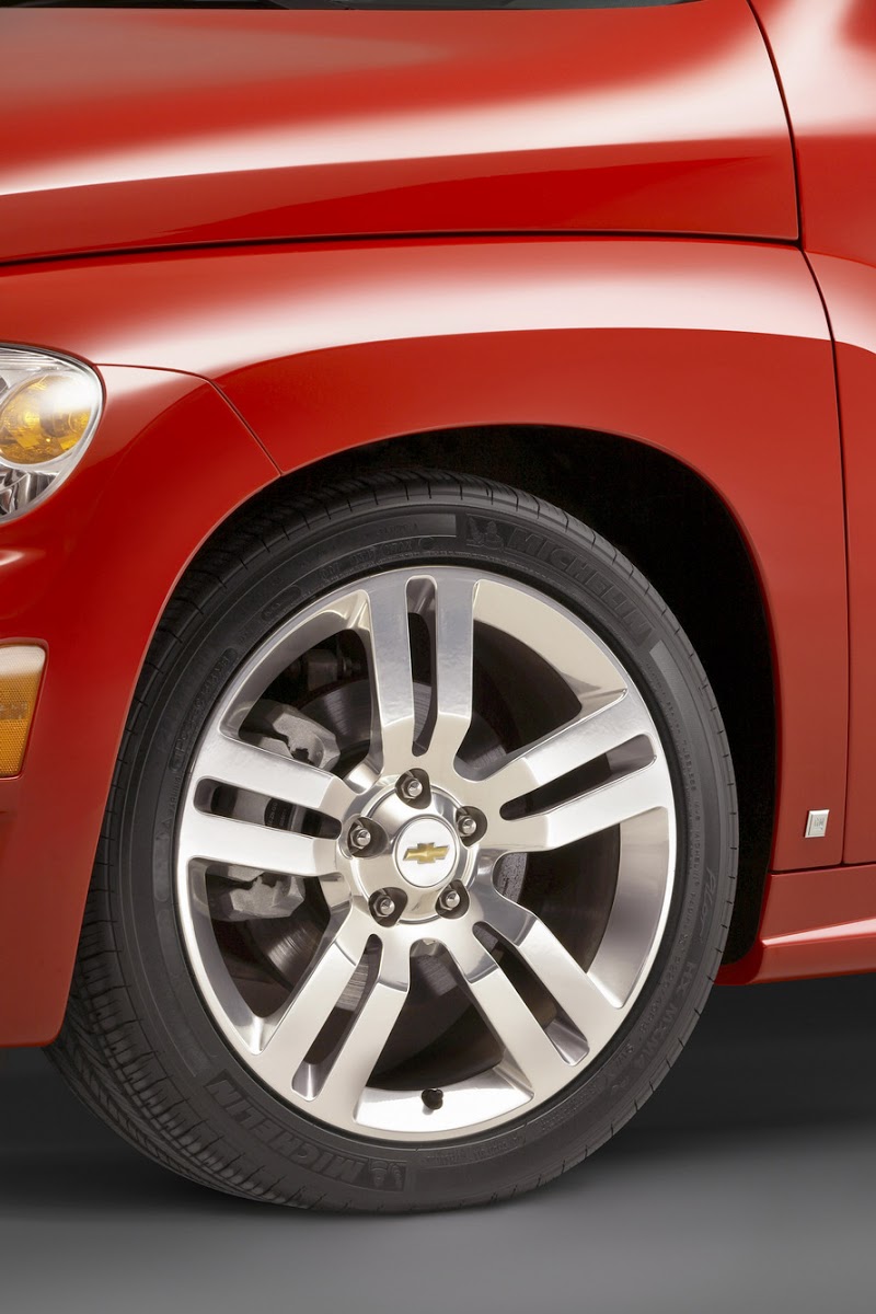 Large, five-spoke 18-inch polished forged aluminum wheels and performance tires are standard and are tailored with the specific body enhancements to give the HHR SS a lower, performance-oriented stance. Likewise, the available exterior colors enhance the sporty nature of the vehicle. They include Victory Red, Black, Light Tarnished Silver Metallic, Mystique Blue Flash Metallic and Sunburst Orange II Metallic.