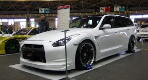 To be completely frank, what you see pictured above is a R35 GT-R faced Nissan Stagea M35, a Japanese-market model produced from 2001 to 2007 which is commonly referred to as the Skyline Station Wagon as it is based on the Skyline/Infiniti G35 V35 platform. On show at the Nagoya Auto Trend show, this canny conversion from Japanese speciality tuner “Kids Heart”, combines the front end of the almighty GT-R with the practical body of the Stagea.