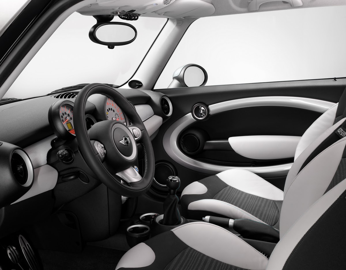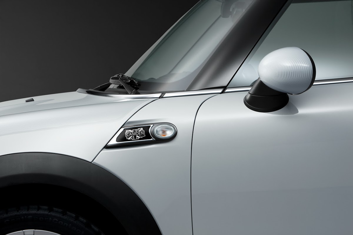 The side indicator frames house the Union Jack in black-and-white and the “Camden” model designation forming the logo of this special anniversary model also to be admired, together with the designation “MINI 50”, on the door entry trim. The interior of the MINI 50 Camden comes in an equally contrasting colour scheme combining the Carbon Black interior colour with special trim on the instrument panel interchanging from white to silver, like the caps on the exterior mirrors.
