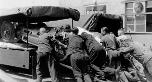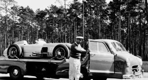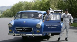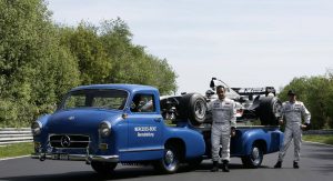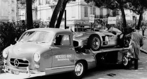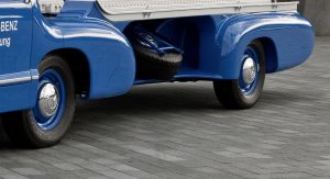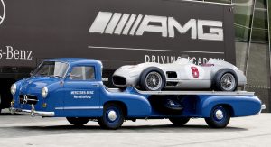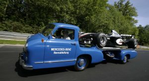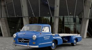 Power was provided by a three-liter inline-six with direct-injection that came straight from the legendary 300 SL Gullwing sports car of 1955, while various body components such as the doors, wings and some of the interior appointments were sourced from the Mercedes-Benz 180 standard saloon. It was then billed as the ‘fastest racing car transporter in the world’.