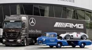 As part of this year’s celebrations for the 75th anniversary of the Mercedes-Benz Silver Arrows, the German automaker has brought together three generations of trucks that have been used to transfer the firm’s racing cars over the years. These include the 1934 Lo 2750, an awesome replica of the once fastest racing car transporter in the world, the so-called ‘Blue Wonder’ from 1955 that was powered by the original Gullwing’s direct-injection engine, and a modern day Actros Truck.