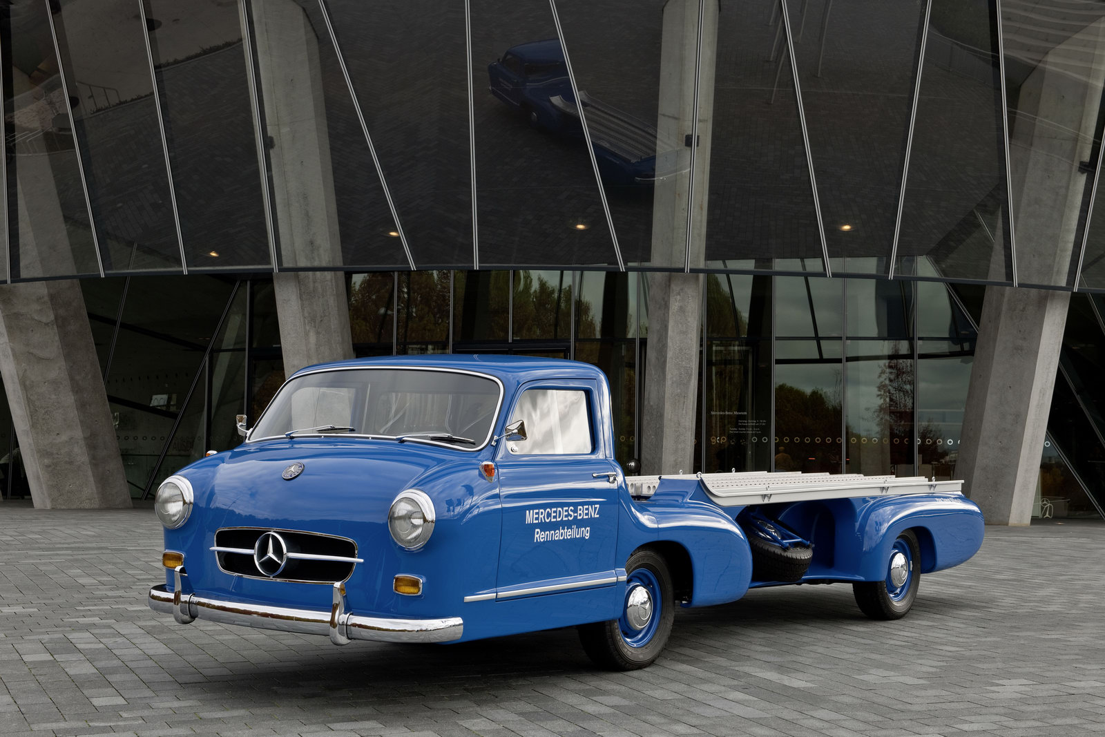 Needless to say, the one that stands out like a shining star is the official replica of the ‘Blue Wonder’. Built at the request of racing manager Alfred Neubauer in the mid 1950s, this one-of-a-kind transporter served Mercedes-Benz for more than a decade.