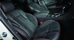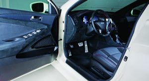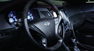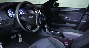 Inspiration for the Sonata Turbo’s interior is said to have come from the Ferrari F430 [again, this is what Hyundai claims in the official press release], with stitched leather and alcantara used throughout the cabin and carbon fiber trim accents.
