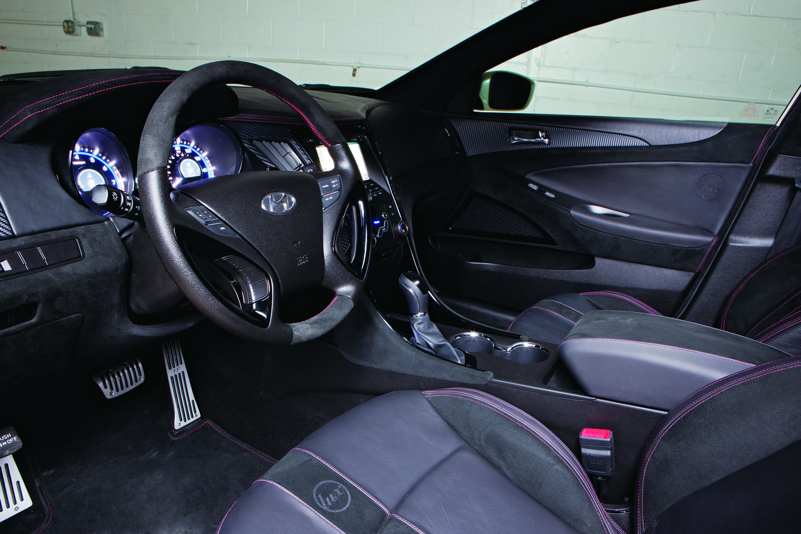 Inspiration for the Sonata Turbo’s interior is said to have come from the Ferrari F430 [again, this is what Hyundai claims in the official press release], with stitched leather and alcantara used throughout the cabin and carbon fiber trim accents.
