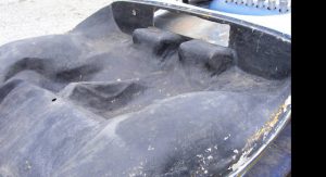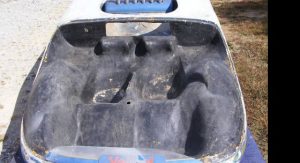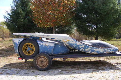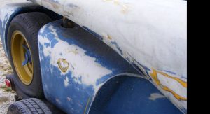 Unfortunately, the Miura Le Mans hasn’t aged very well, as the canopy is broken into several pieces and the engine is gone. However, many parts are still there, including the rear and front suspension, golden rear alloys with blue knockoffs, double nose wheels, brakes, calipers and steering.
