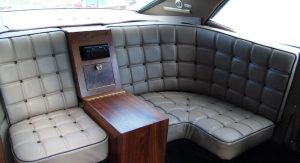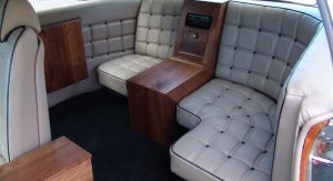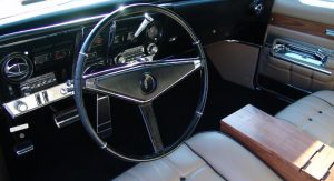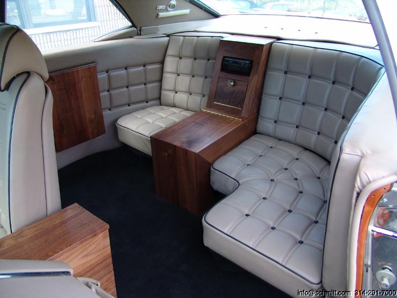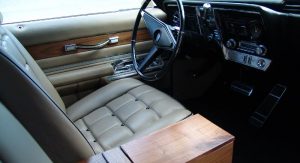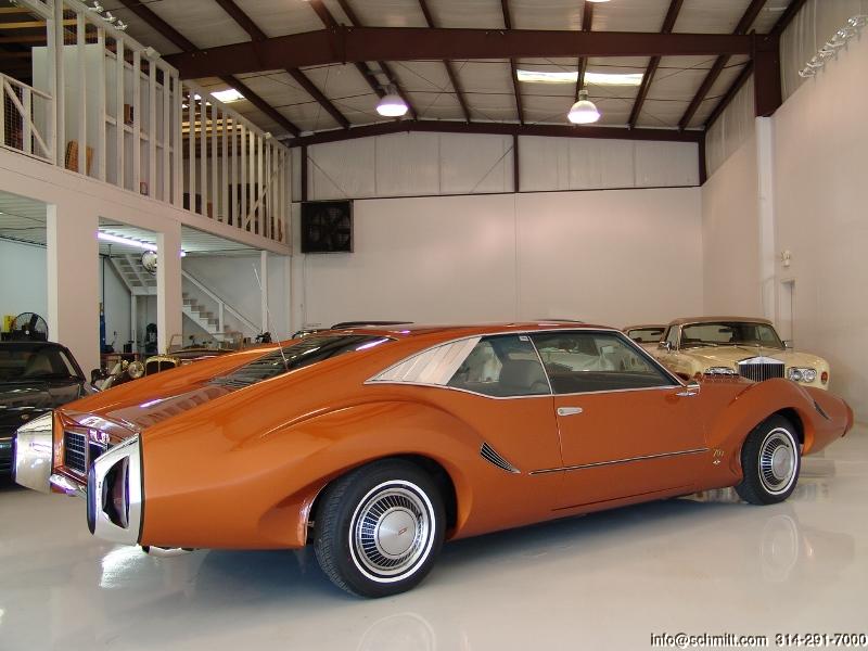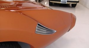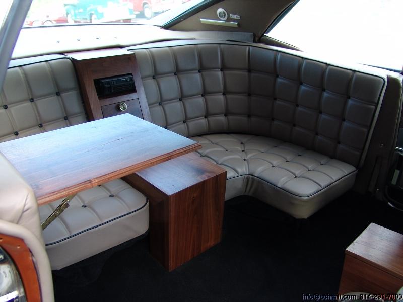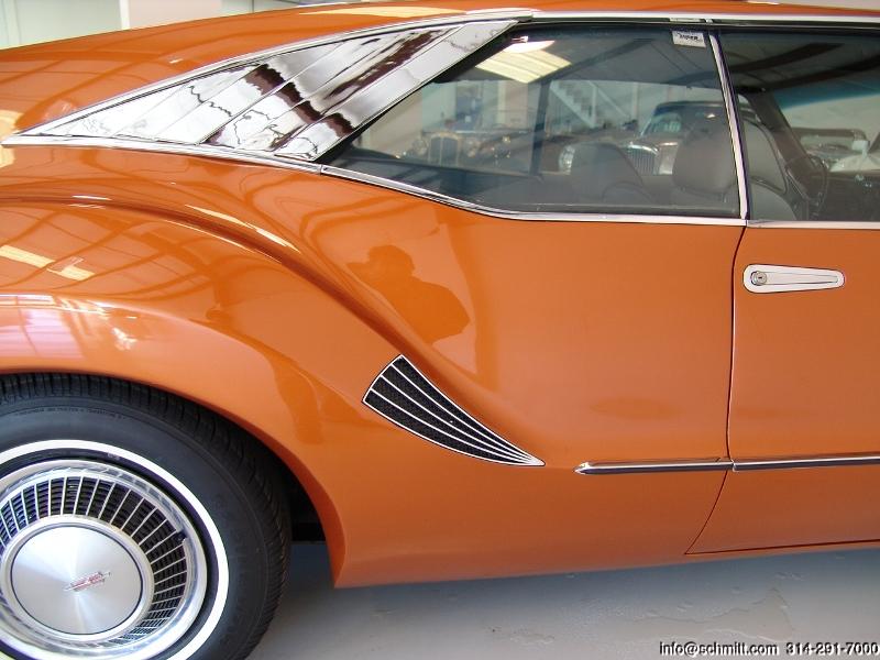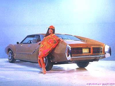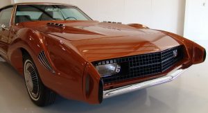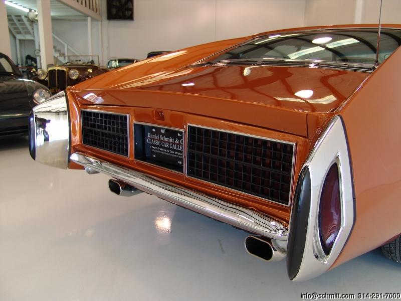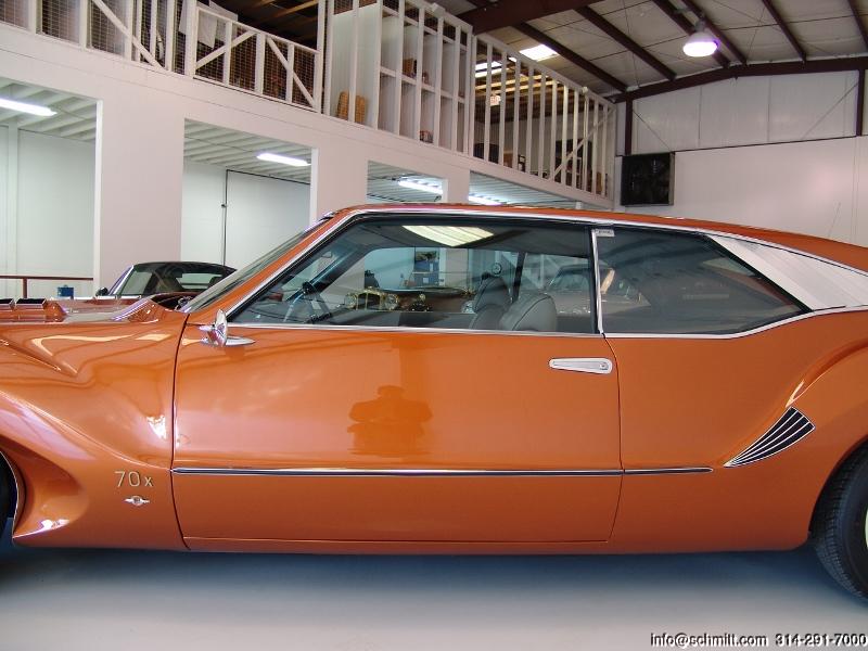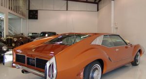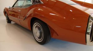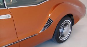 Barris built upon the ’67 Toronado’s design language, enlarging the fender protrusions at the front and extending them to the rear. He pumped up the wheel arches and added fluted chrome indicator housings and side vents. Chrome helps disguise the width of the C-pillars and subtle intakes on the hood give the 70-X a sportier appearance. The interior is adorned with a wrap around rear couch, tan leather and lots of custom wooden elements including a fold out writing desk.