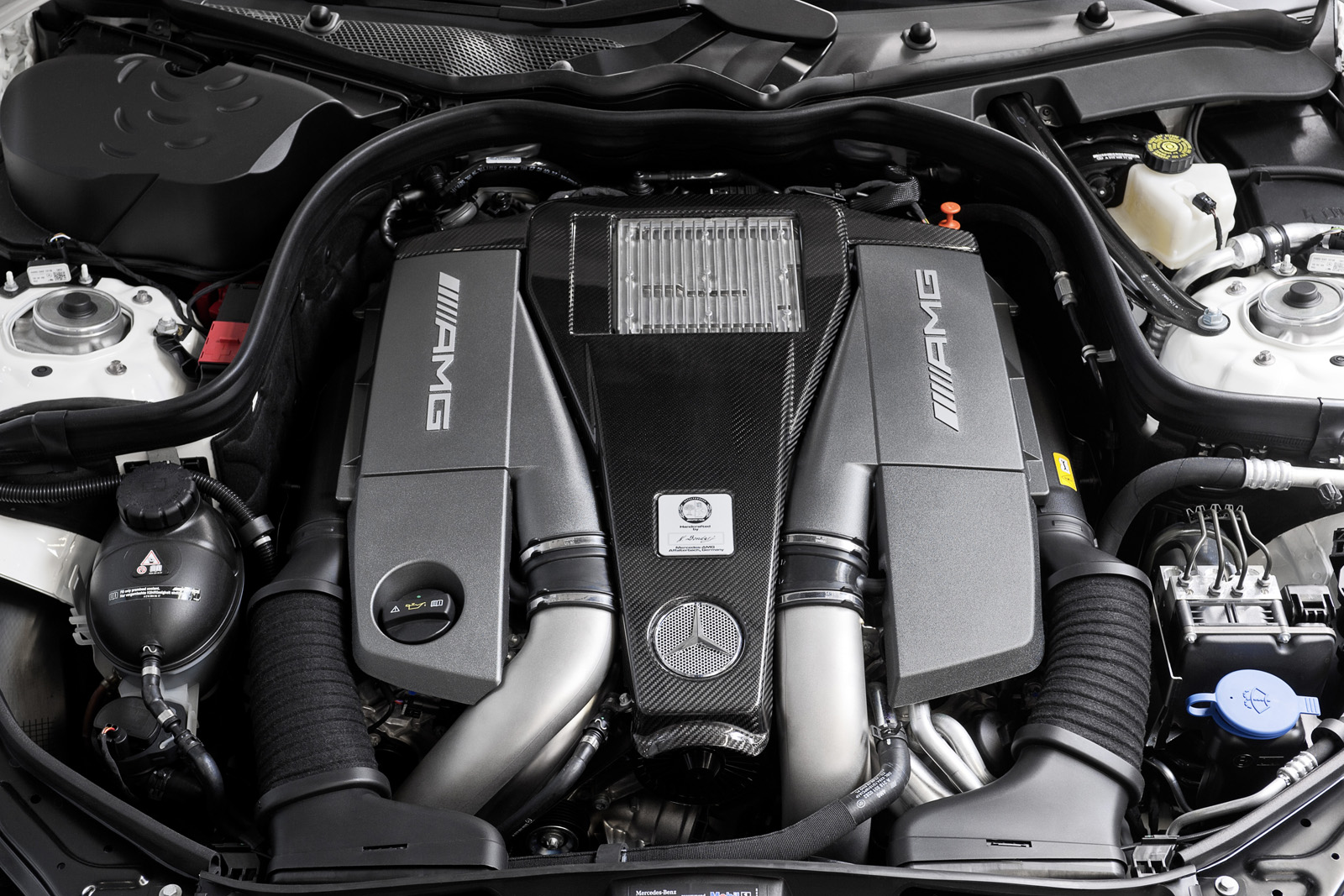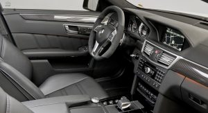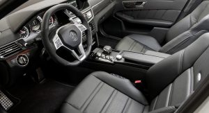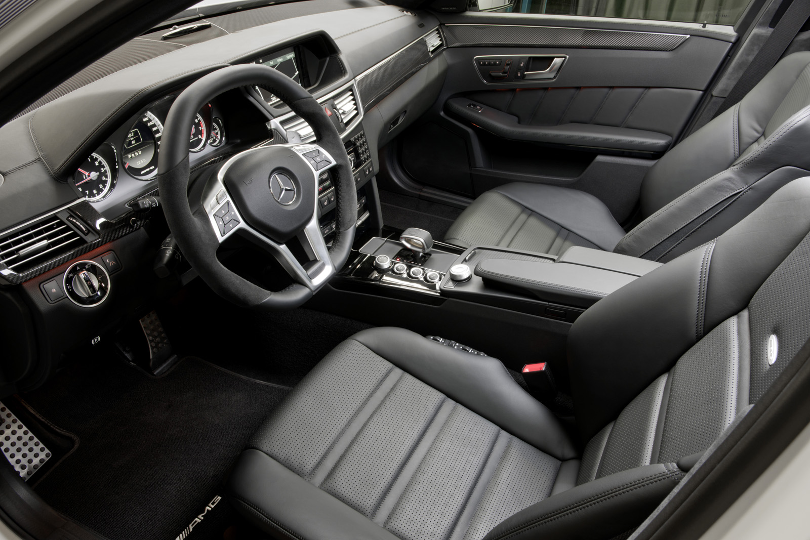 Visually, the E63 AMG with the new M157 engine has new light-alloy wheels and the “V8 Biturbo” badge on the front wings. Inside, the car gets the flat-top and -bottom steering wheel from the CLS63 AMG, a new E-Select shift lever with embossed AMG badge and a 3-D TFT color display in the center of the speedometer.