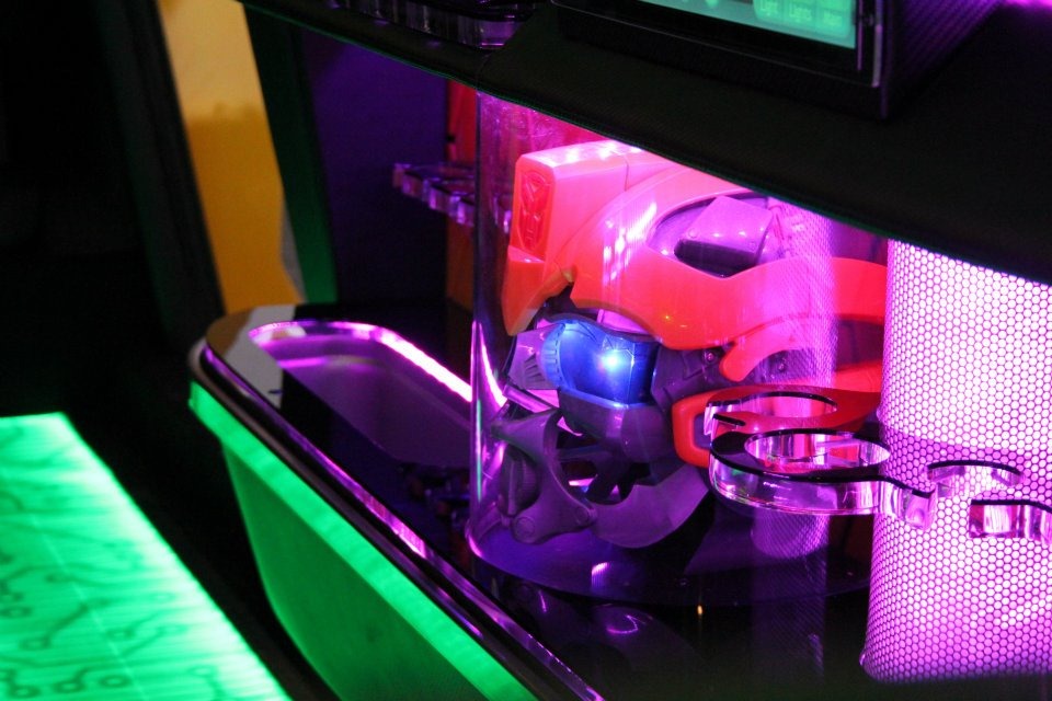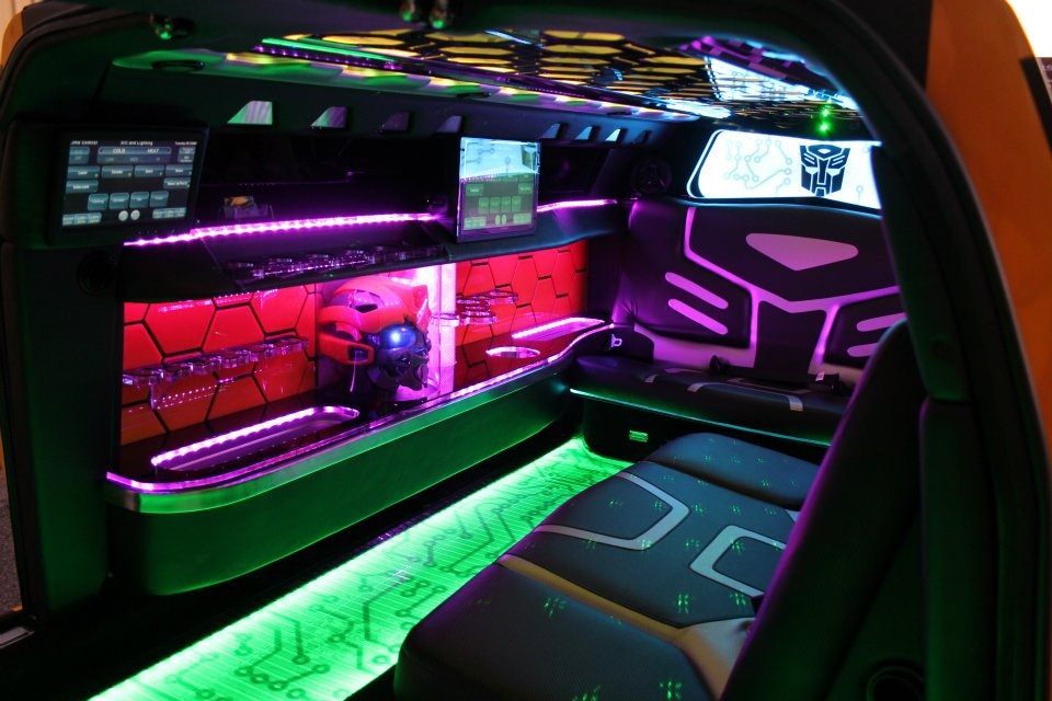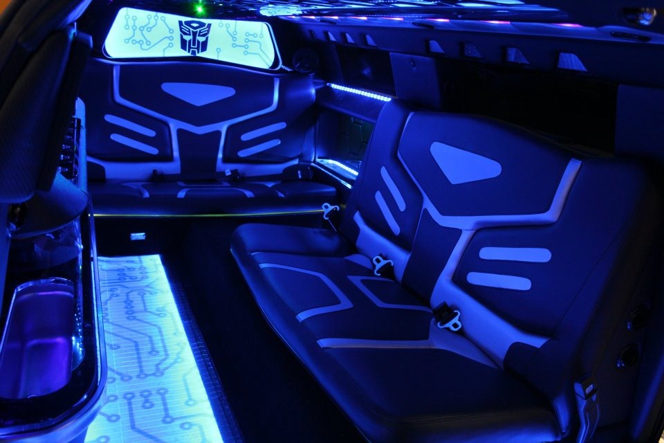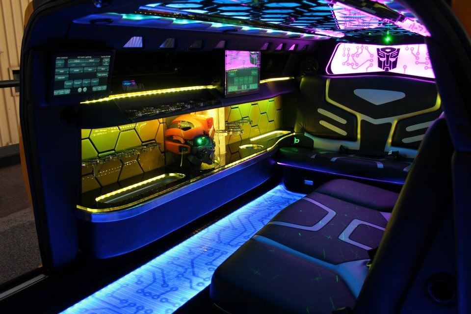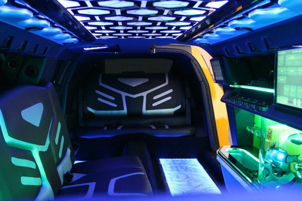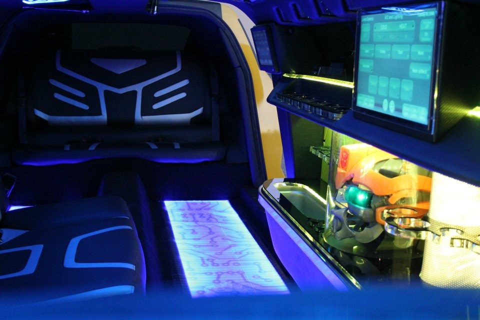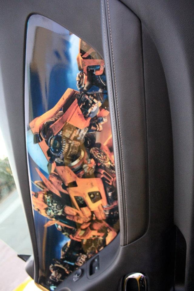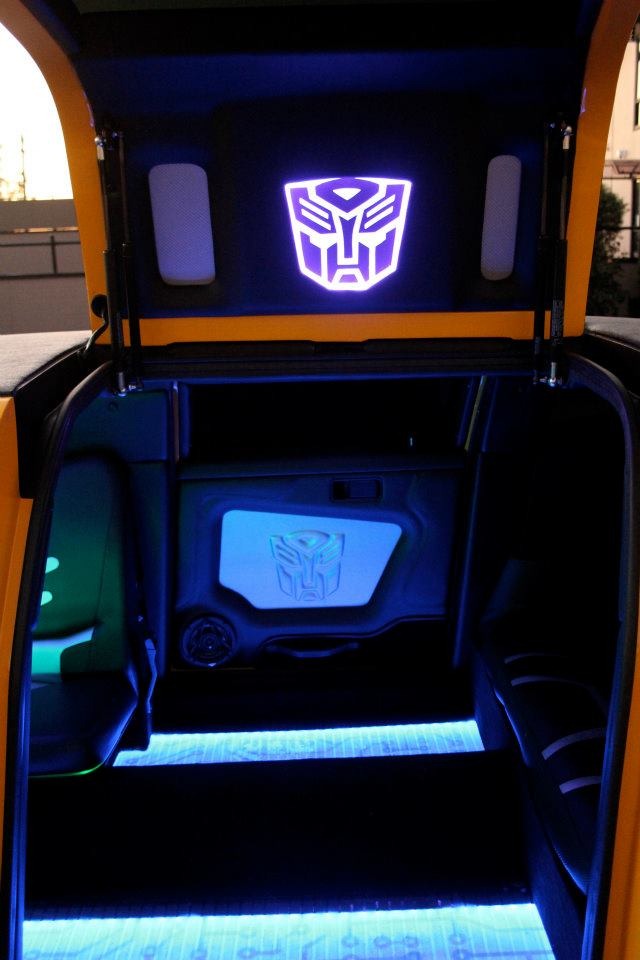 The Transformers-theme continues inside once you lift the scissor-style front doors or the gull wing-type rear doors, with the designer even incorporating…Bumblebee’s head in what we assume to be the bar.