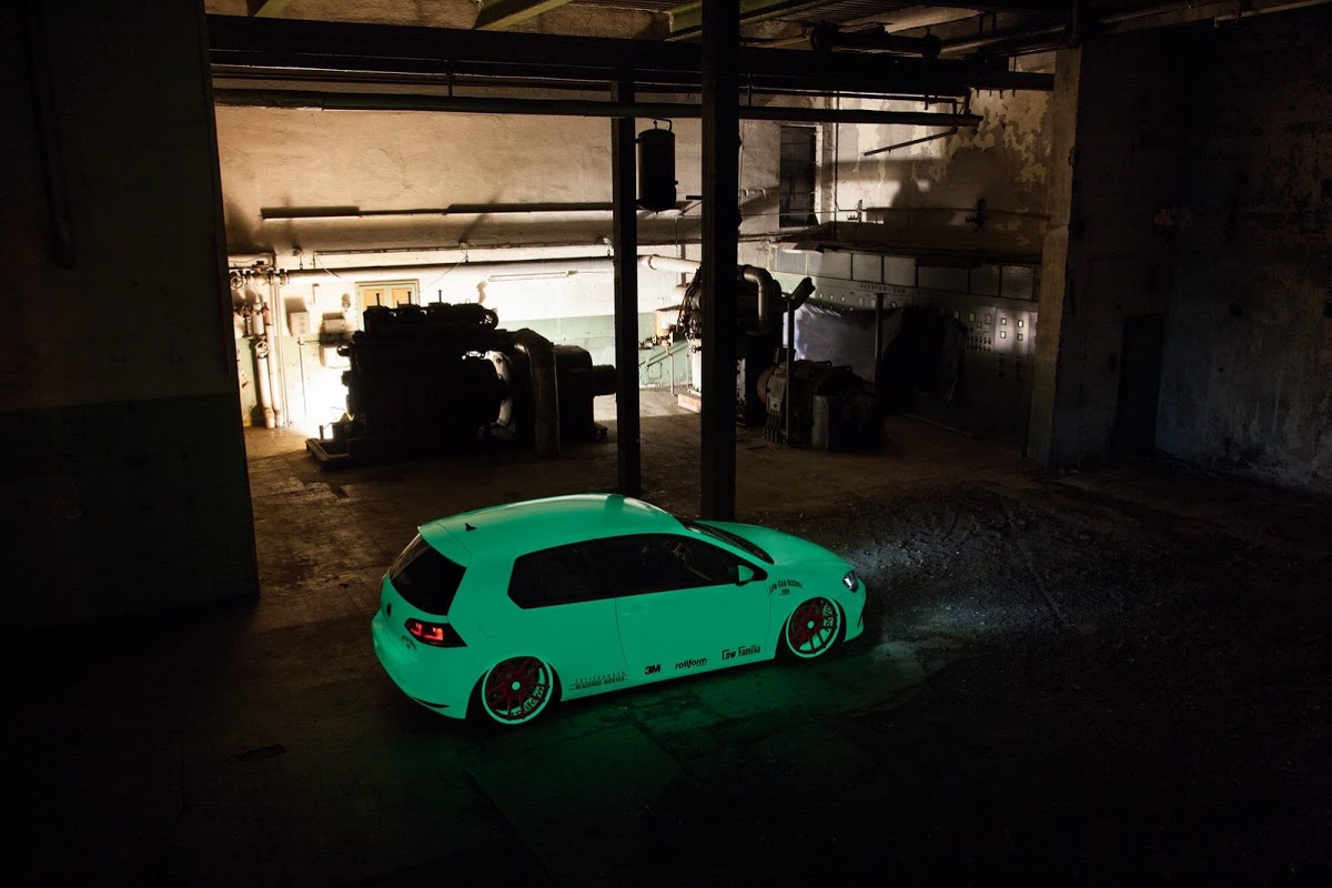BlackBox-Richter began with a regular black-colored 2013 Volkswagen Golf 1.4 TSI hatchback, which it covered in a special, phosphor-foil wrap from 3M in white for the body and soft-pink shade for the stripes and details, which turn green and black respectively when the lights go off.