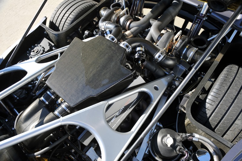 Priced at a hefty $1.2 million or about €940,000 at the current exchange rates with only 29 cars to be made, Hennessey’s Venom GT is propelled by a GM-sourced 7.0-liter (427 cubic inch) LS9 V8 fed by twin turbochargers delivering 1,244 horsepower and 1,155 lb-ft of torque at 19 psi (1.3 bar) of boost pressure. All those crazy horses have only 1,244 kg (2,743 lbs) of mass to move around.