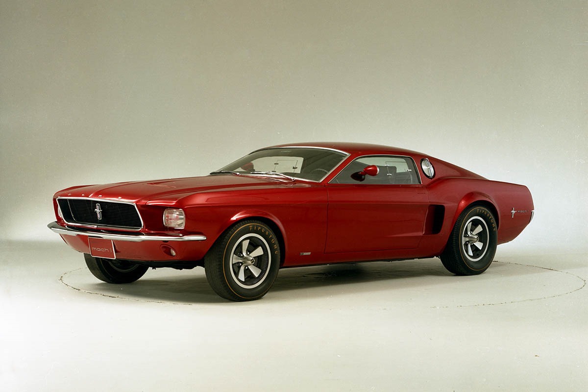 Created as a preview of the 1968 model, the Mach 1 Concept originally had a nose that drew inspiration from the 1963 Mustang II concept. Later on, the Mach 1 grew a new face that was closer to production Mustangs of the time. Although the low-cut roofline and racing-type fuel cap never made it to production, the hatchback did arrive on the 1974 Mustang II.