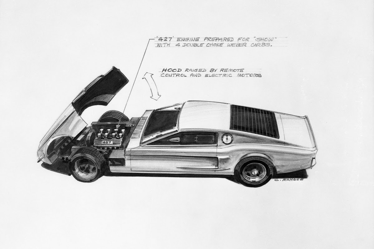 In 1967, Ford designers took one of the concepts from 1962 and transformed it by removing the greenhouse and replacing it with a low-cut speedster-style windshield, rollbar, flying buttresses on the rear deck and a new rear end.