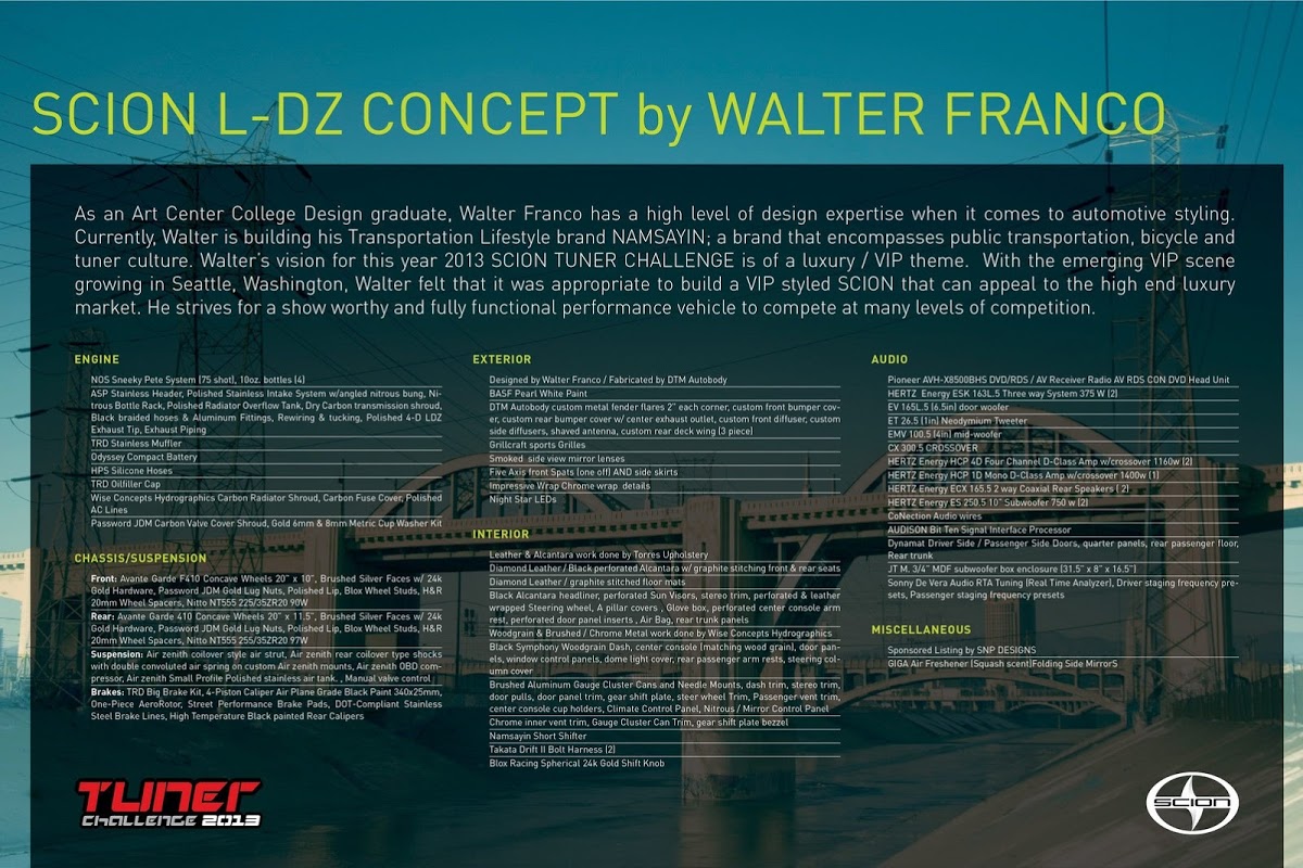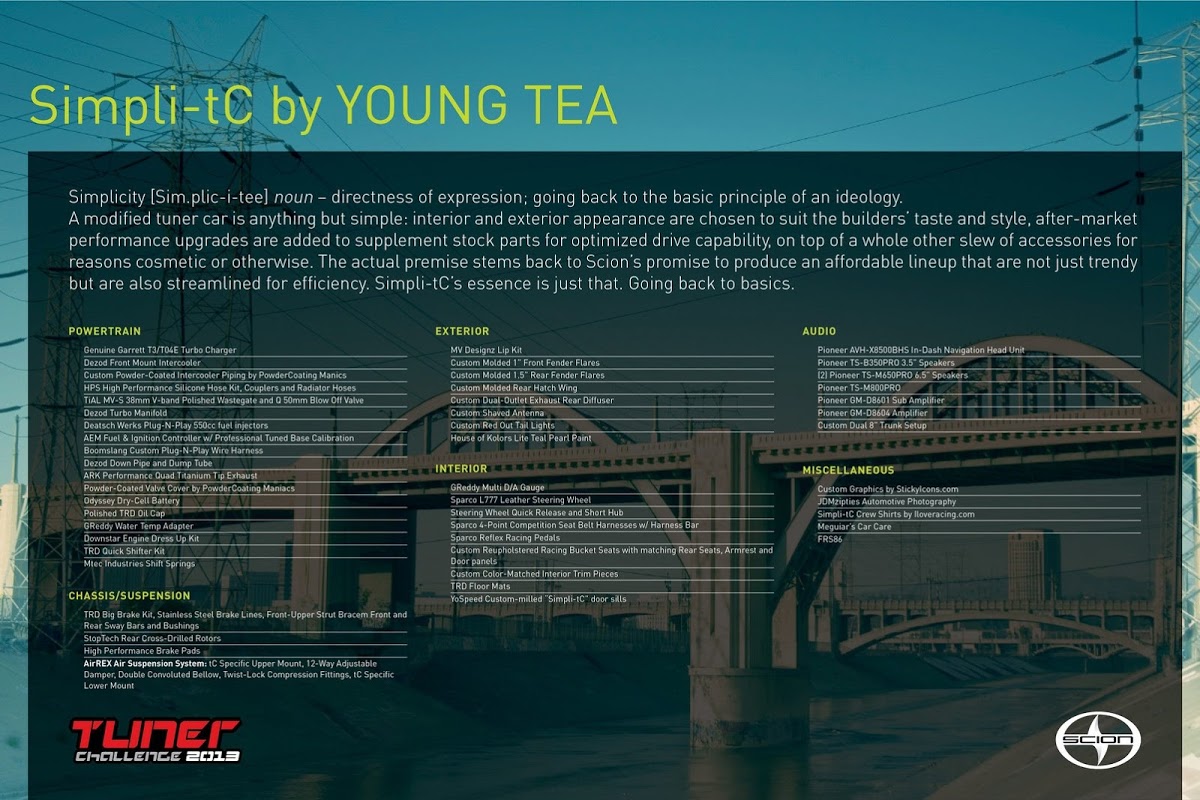 The third and final concept is the Simpli-tC by Young Yea from California, who is the co-founder of the Scion FR-S community FRS86. The teal-colored tC sports a wide body and hunkered down stance, along with a turbocharged engine, among many other upgrades.
