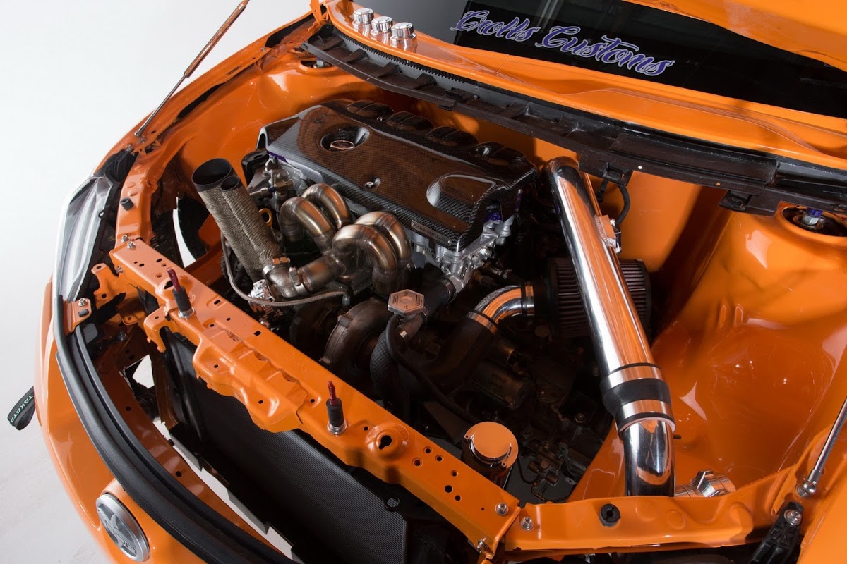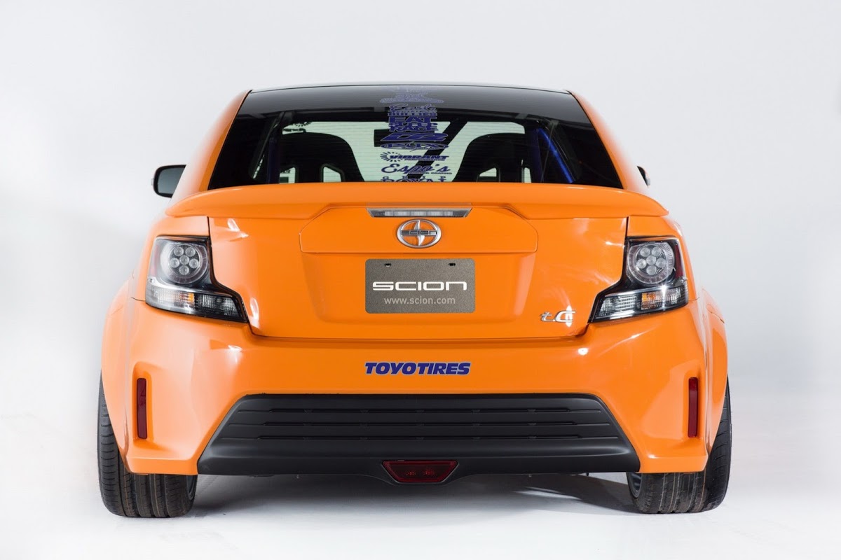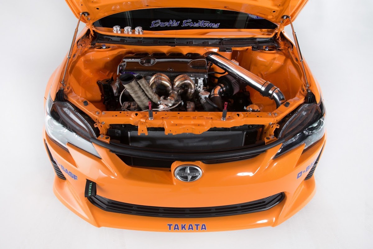 The first model finished in an orange tri-coat paint is the tC WSD by Josh Croll, owner of Croll’s Customs in Pennsylvania. It’s the world’s first right hand drive version of the car (or so Scion says), and is powered by a heavily modified turbocharged four pushing out 324 wheel-horsepower.