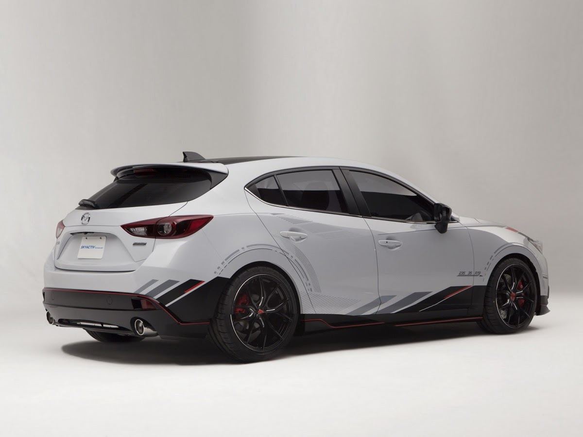 The two Mazda3 studies are the Club Sport hatchback with a 2.5-liter four-cylinder unit paired to a manual gearbox and an array of performance upgrades, including an aero package and 20-inch wheels, and the other is the Vector 3 sedan with a bespoke Soul Red paint highlighted by custom blend of Deep Crimson in varying shades of depth, a ground effects kit and 19 Rays Volk rims.