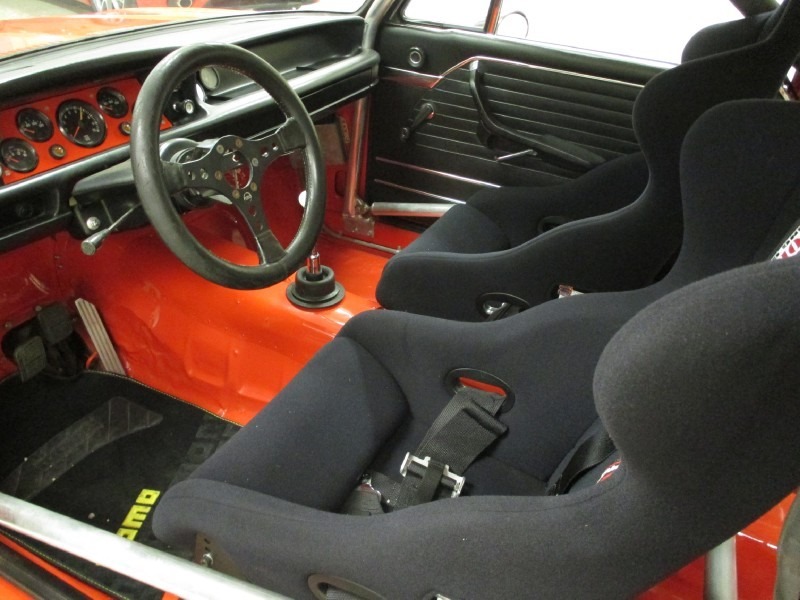 Most of the interior was stripped down with the rear seats deleted to make way for a custom aluminum roll cage, while up front there’s a custom dash, a smaller sports steering wheel and a pair of Sabelt racing seats.