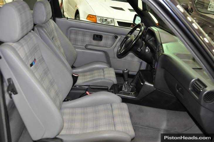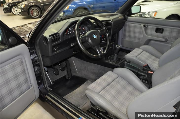 According to the seller, “the wheels are not the original type being changed for wider lighter BBS ones and also the Steering wheel has been changed for a later M Sport type”, otherwise the car is stock and has those lovely part leather, part fabric checkered seats.